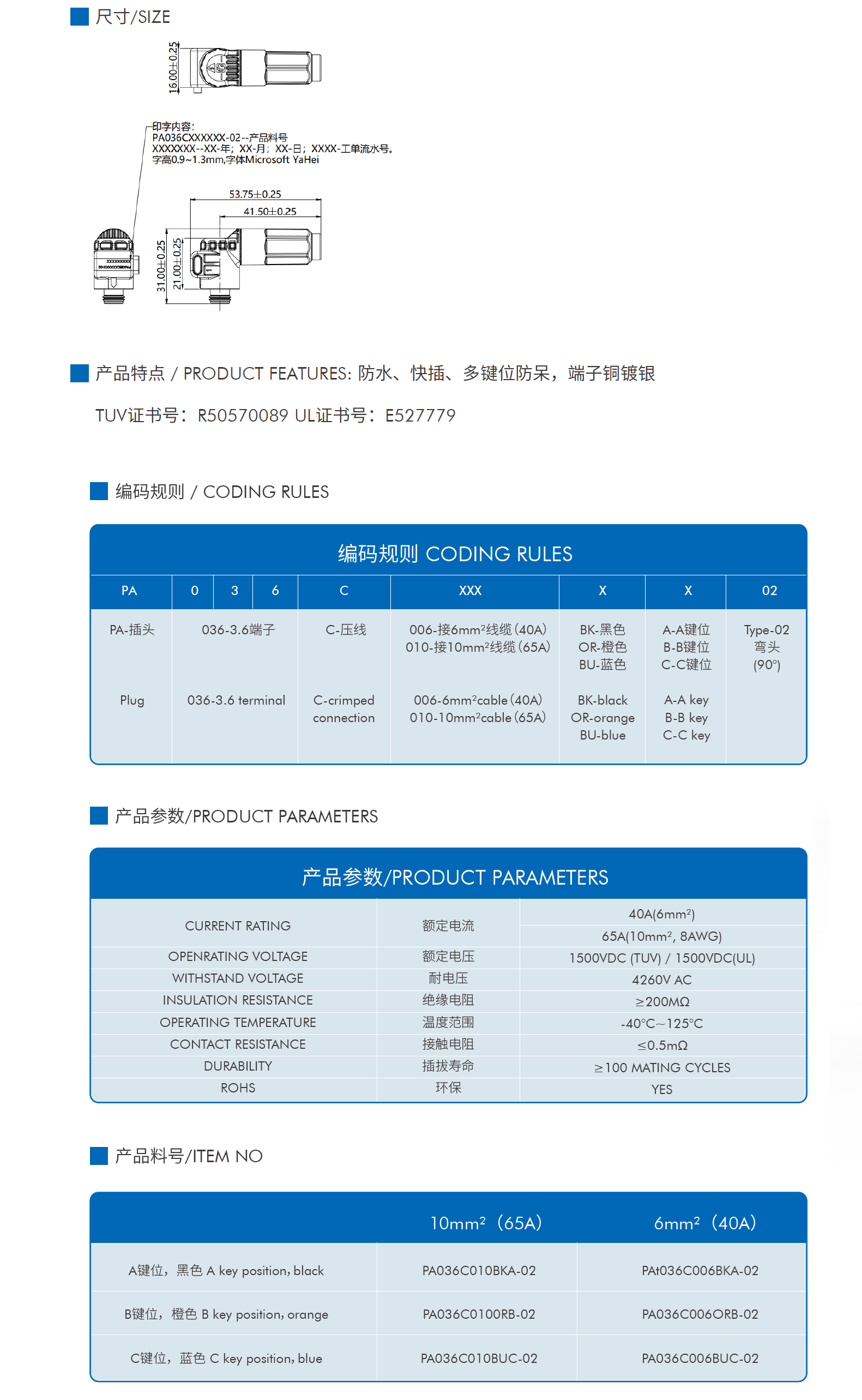 产品特点 / PRODUCT FEATURES: 防水、快插、多键位防呆,端子铜镀银 电气特性 额定电压:1500VDC(TUV)/1500VDC(UL) 耐电压:4260V AC 接触电阻:≤0.5mΩ 绝缘电阻:≥200MΩ 耐环境性能 温度范围:-40°C~125°C 防水等级:IP67 盐雾等级:96H 插拔寿命:≥100 MATING CYCLES 环保:YES