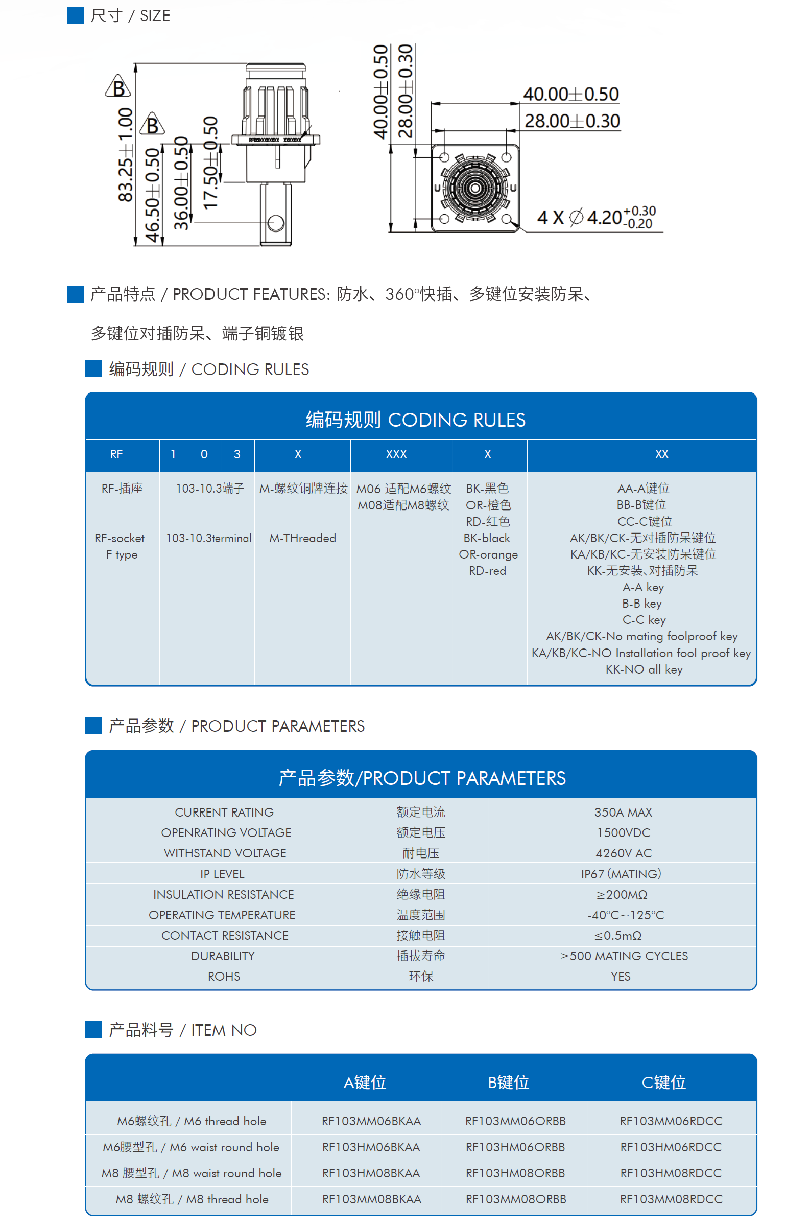 产品特点 / PRODUCT FEATURES: 防水、360°快插、多键位安装防呆、多键位对插防呆、端子铜镀银 电气特性 额定电压:1500VDC 耐电压:4260V AC 接触电阻:≤0.5mΩ 绝缘电阻:≥200MΩ 耐环境性能 温度范围:-40°C~125°C 防水等级:IP67 盐雾等级:96H 插拔寿命:≥500 MATING CYCLES 环保:YES