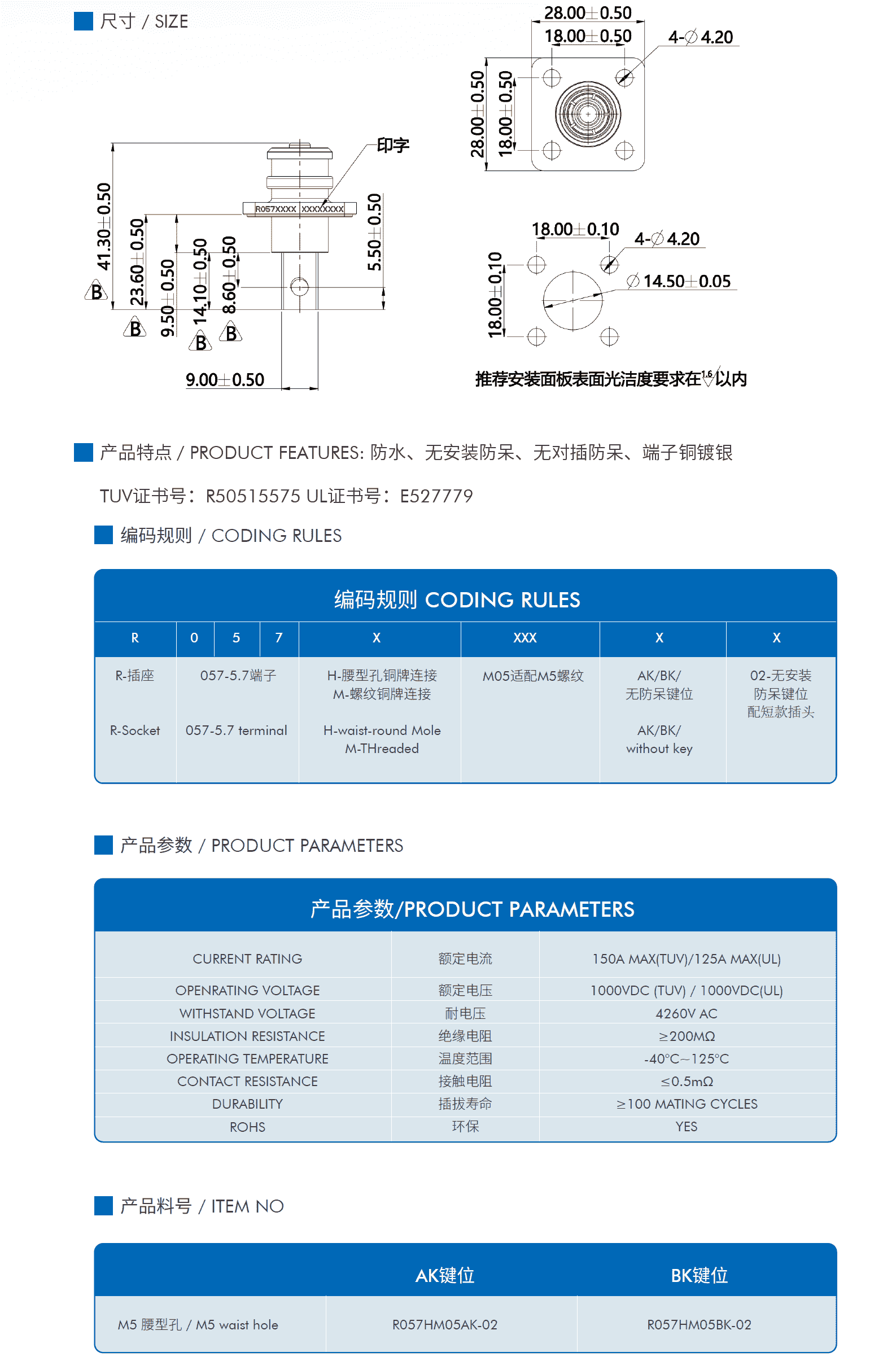 产品特点 / PRODUCT FEATURES: 防水、无键位及多键位快插、端子铜镀银 电气特性 额定电压:1500VDC(TUV)/1500VDC(UL) 耐电压:4260V AC 接触电阻:≤0.5mΩ 绝缘电阻:≥200MΩ 耐环境性能 温度范围:-40°C~125°C 防水等级:IP67 盐雾等级:96H 插拔寿命:≥100 MATING CYCLES 环保:YES