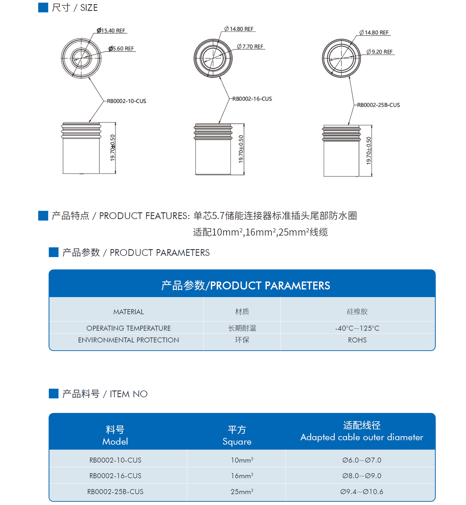 产品特点 / PRODUCT FEATURES: 单芯5.7储能连接器标准插头尾部防水圈适配10mm2,16mm2,25mm2线缆 产品参数 材质:硅橡胶 耐环境性能 温度范围:-40°C~125°C 防水等级:IP67 环保:ROHS
