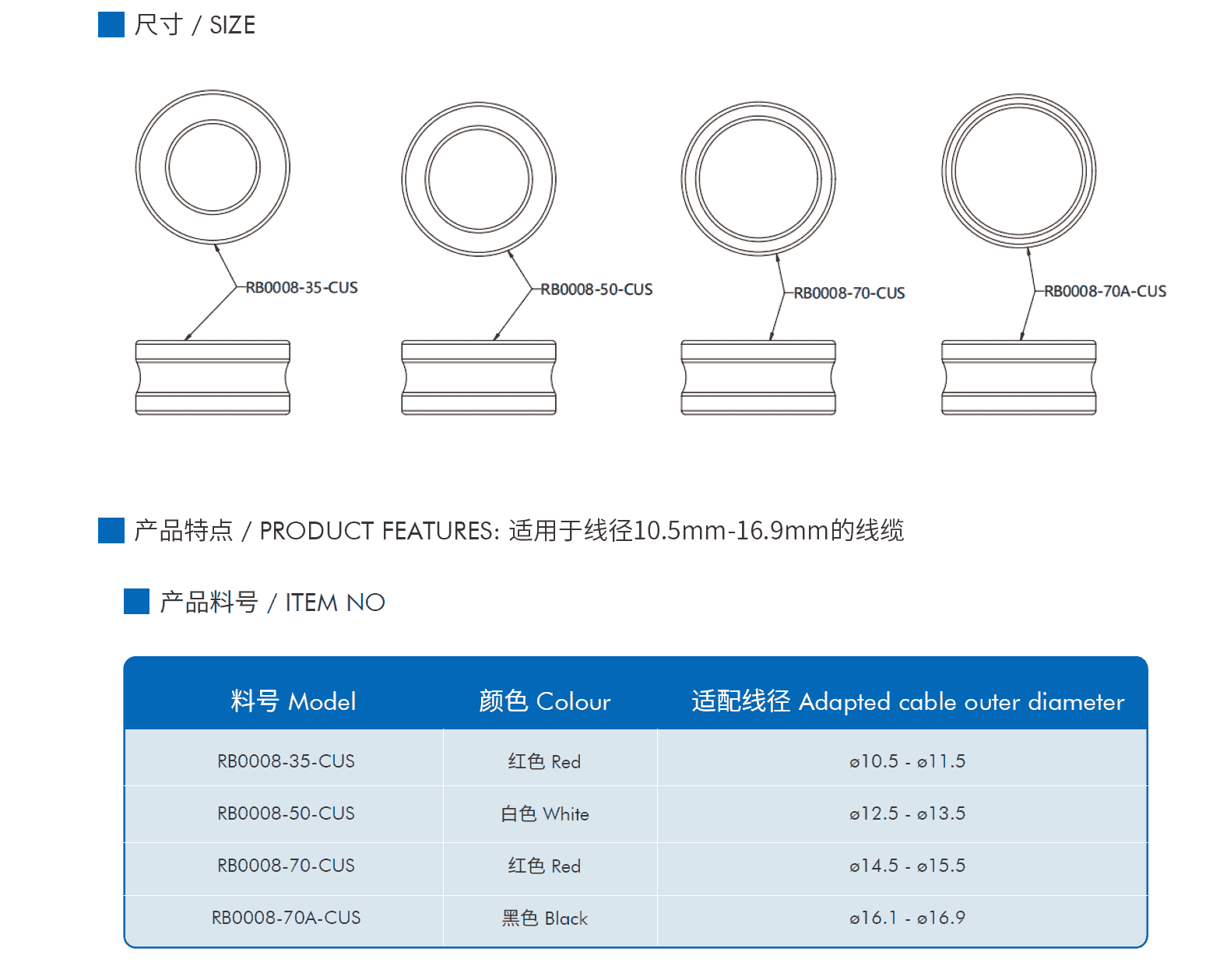 产品特点 / PRODUCT FEATURES: 适用于线径10.5mm-16.9mm的线缆 产品参数 材质:硅橡胶 耐环境性能 温度范围:-40°C~125°C 防水等级:IP67 环保:ROHS