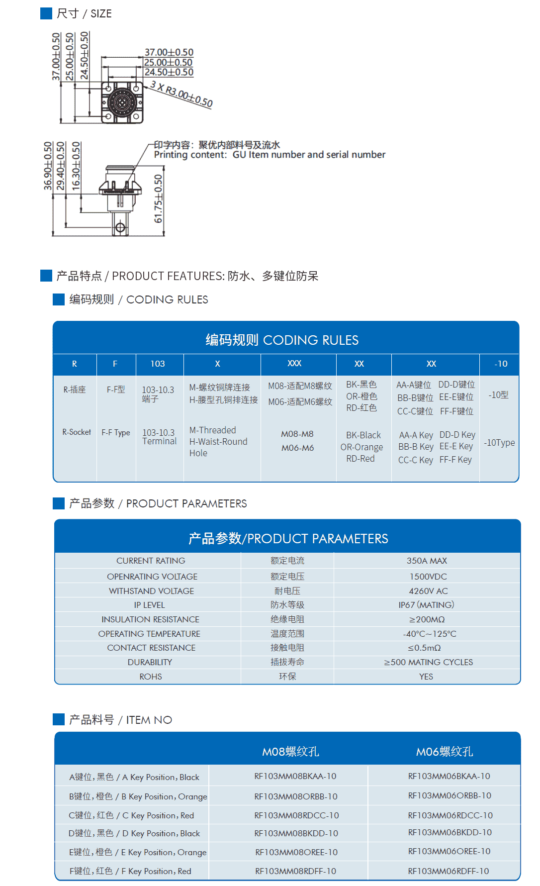 产品特点 / PRODUCT FEATURES: 防水、多键位防呆 电气特性 额定电流:250A MAX 额定电压:1500VDC 耐电压:4260V AC 接触电阻:≤0.5mΩ 绝缘电阻:≥200MΩ 耐环境性能 温度范围:-40°C~125°C 防水等级:IP67 插拔寿命:≥500 MATING CYCLES 环保:YES