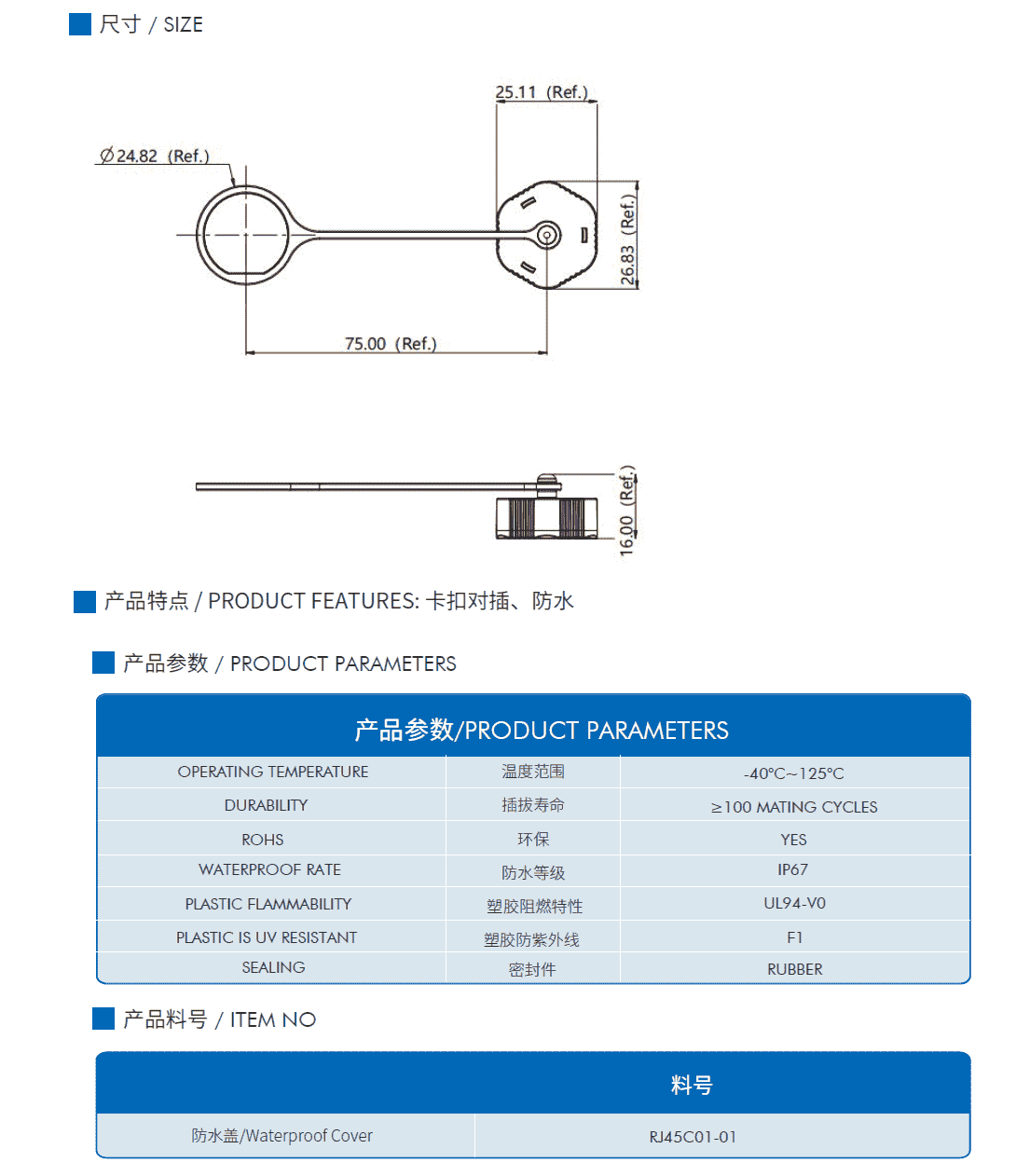 产品特点 / PRODUCT FEATURES:卡扣对插、防水 耐环境性能 温度范围:-40°C~125°C 防水等级:IP67 插拔寿命:≥100 MATING CYCLES 塑胶阻燃特性:UL94-V0 塑胶防紫外线:F1 环保:YES