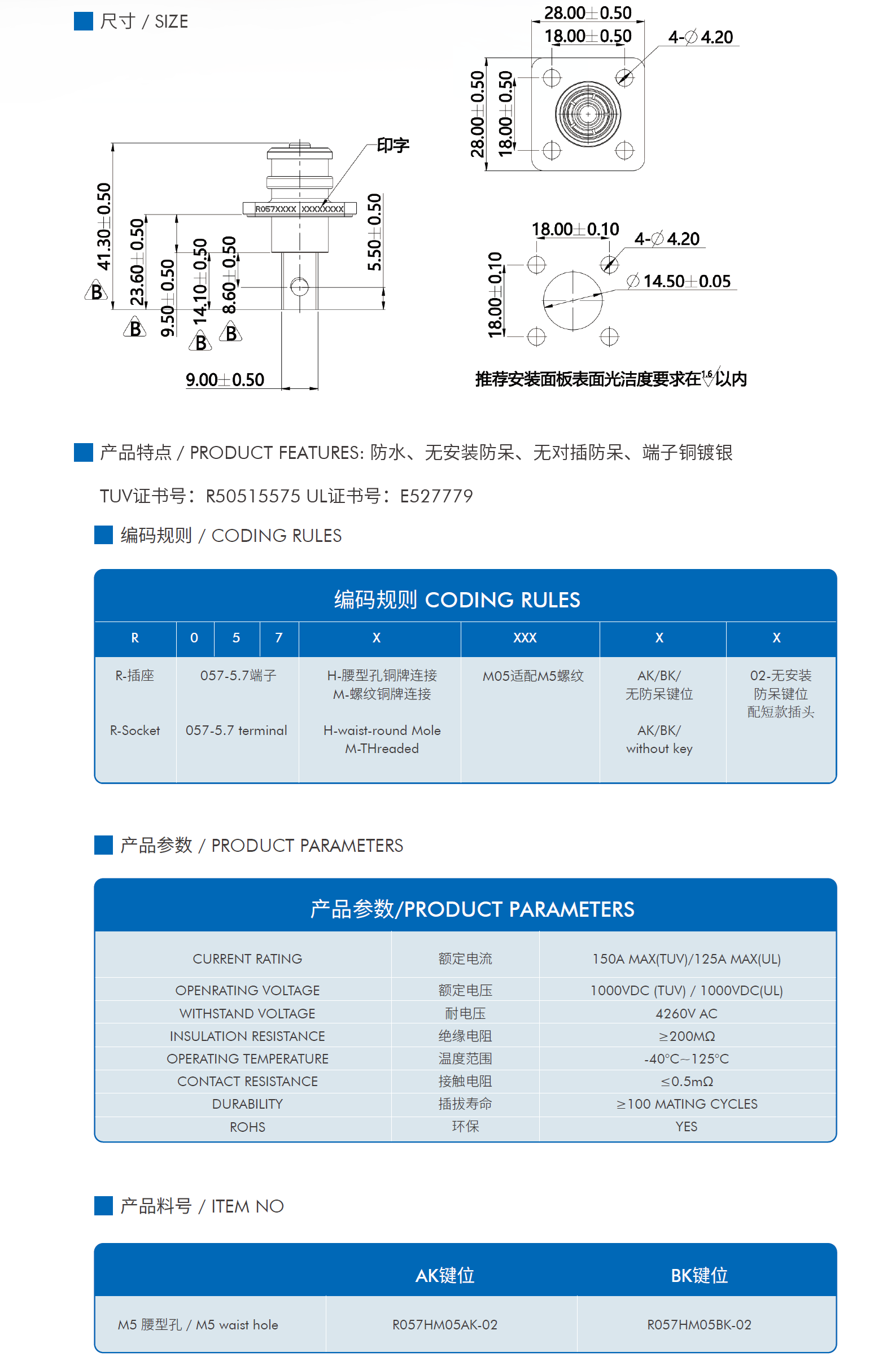 • 绝缘材料采用符合UL4128高绝缘,高耐压的工程塑料