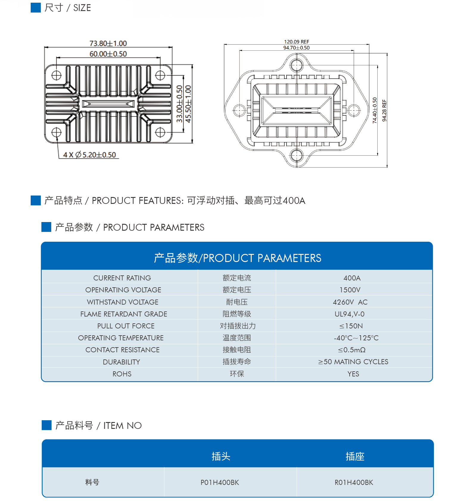 产品特点 / PRODUCT FEATURES: 可浮动对插、最高可过400A 电气特性 额定电流:400A 额定电压:1500V 耐电压:4260V AC 接触电阻:≤0.5mΩ 耐环境性能 温度范围:-40°C~125°C 防水等级:IP67 阻燃等级:UL94,V-0 插拔寿命:≥50 MATING CYCLES 环保:YES