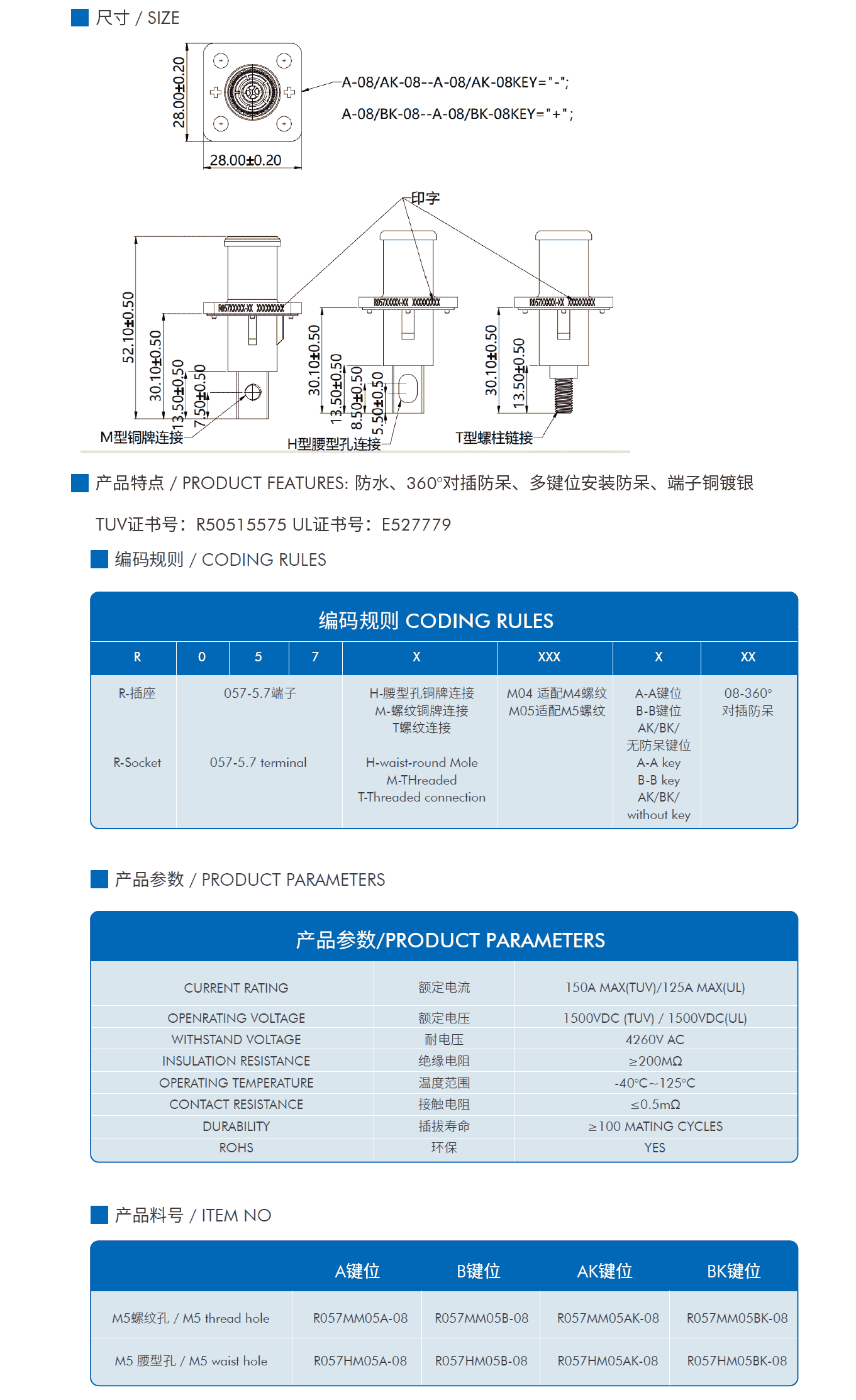 产品特点 / PRODUCT FEATURES: 防水、无键位及多键位快插、端子铜镀银 电气特性 额定电压:1500VDC(TUV)/1500VDC(UL) 耐电压:4260V AC 接触电阻:≤0.5mΩ 绝缘电阻:≥200MΩ 耐环境性能 温度范围:-40°C~125°C 防水等级:IP67 盐雾等级:96H 插拔寿命:≥100 MATING CYCLES 环保:YES