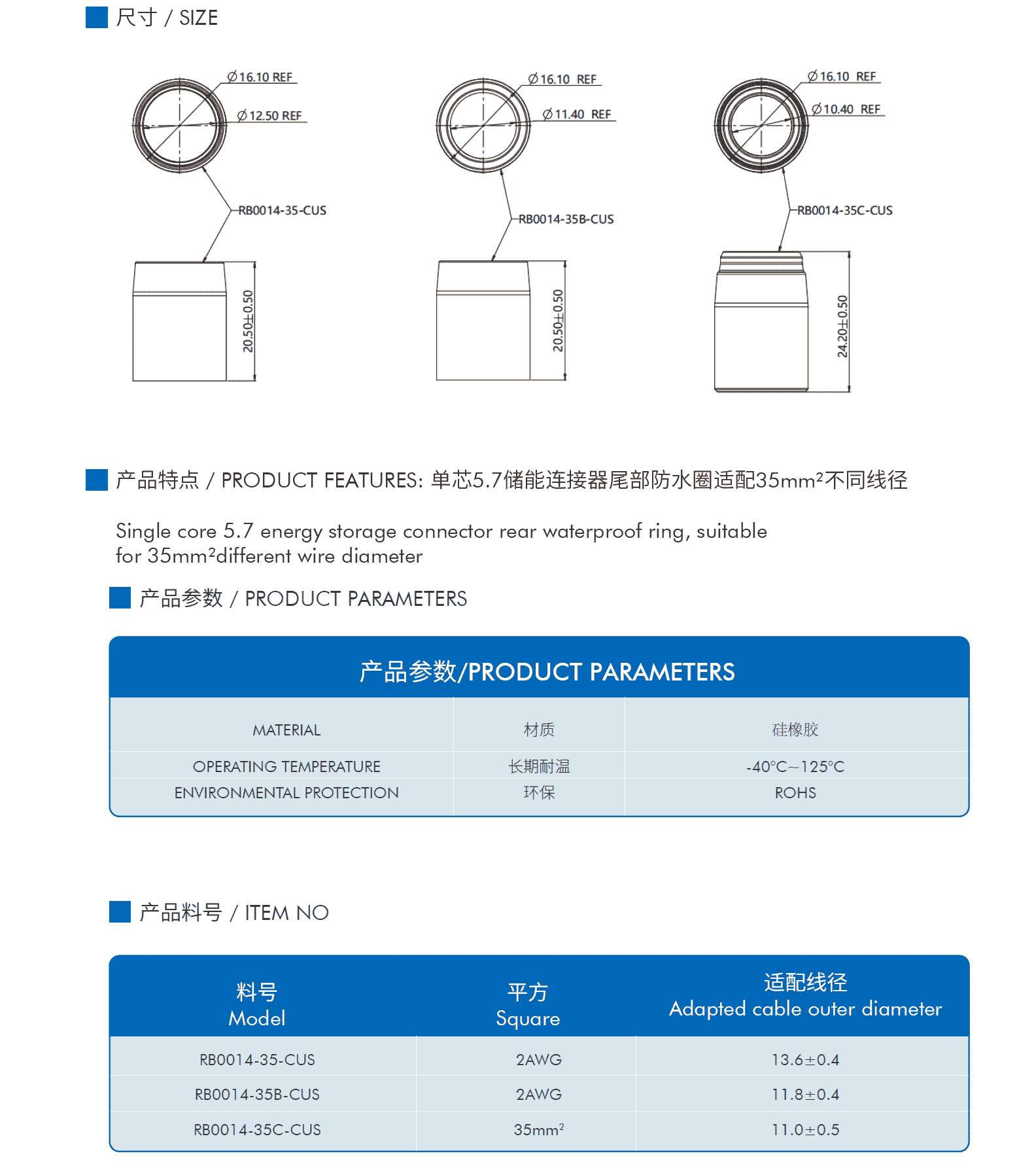 产品特点 / PRODUCT FEATURES: 单芯5.7储能连接器尾部防水圈适配35mm²不同线径 产品参数 材质:硅橡胶 耐环境性能 温度范围:-40°C~125°C 防水等级:IP67 环保:ROHS