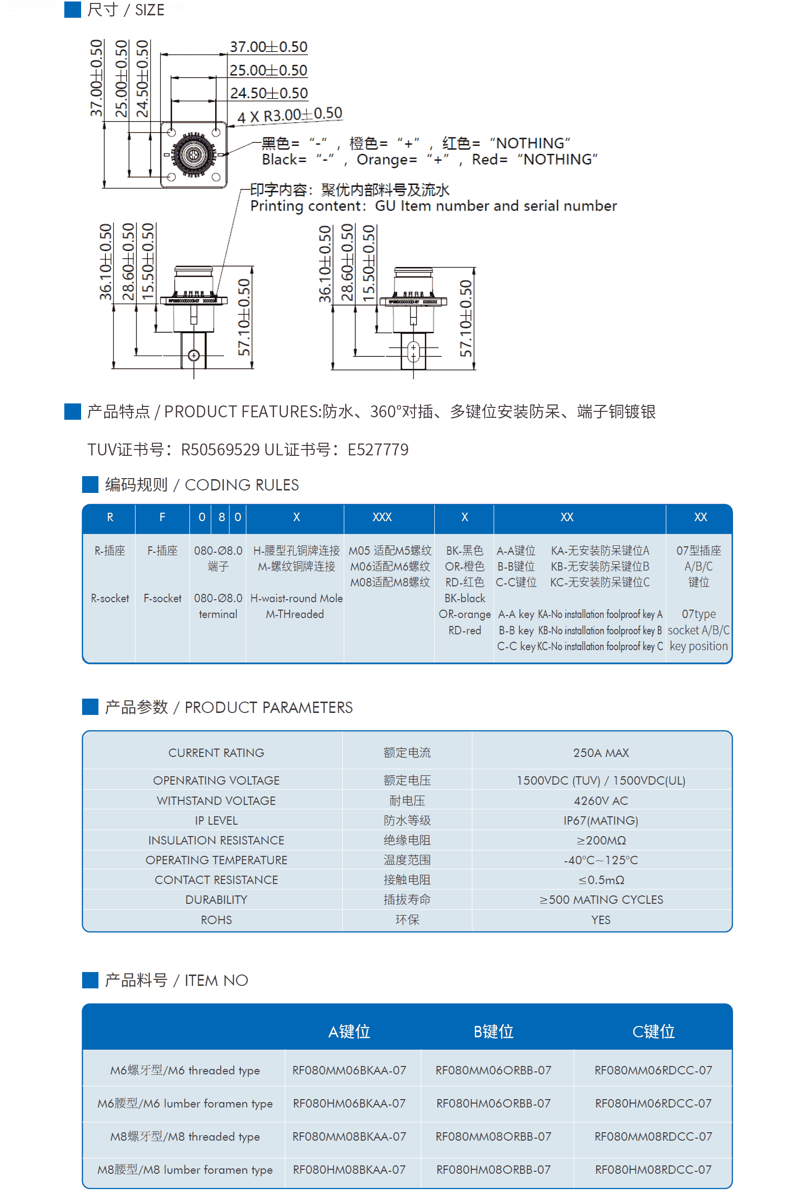 产品特点 / PRODUCT FEATURES: 防水、360°对插、多键位防呆、端子铜镀银 电气特性 额定电压:1500VDC(TUV)/1500VDC(UL) 耐电压:4260V AC 接触电阻:≤0.5mΩ 绝缘电阻:≥200MΩ 耐环境性能 温度范围:-40°C~125°C 防水等级:IP67 盐雾等级:96H 机械特性 插拔寿命:≥500 Mating cycles 环保:YES