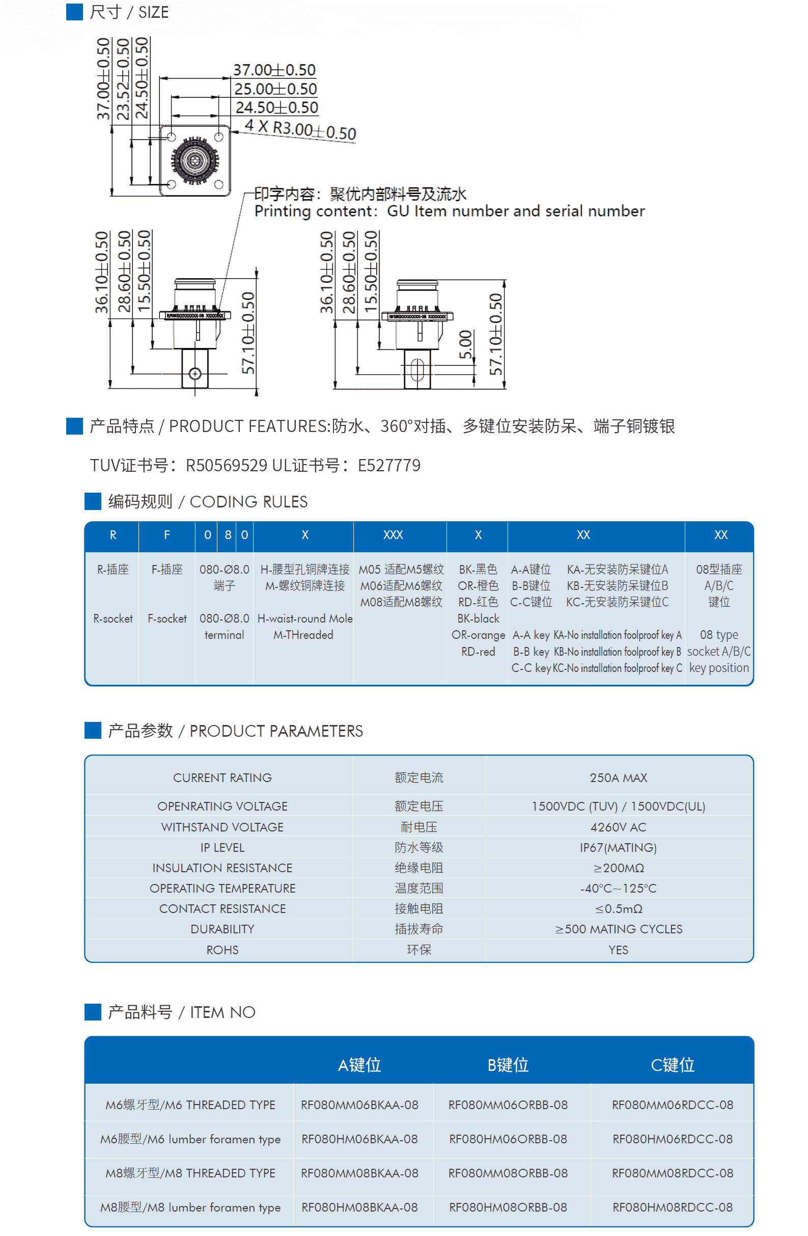 产品特点 / PRODUCT FEATURES: 防水、360°对插、多键位防呆、端子铜镀银 电气特性 额定电压:1500VDC(TUV)/1500VDC(UL) 耐电压:4260V AC 接触电阻:≤0.5mΩ 绝缘电阻:≥200MΩ 耐环境性能 温度范围:-40°C~125°C 防水等级:IP67 盐雾等级:96H 机械特性 插拔寿命:≥500 Mating cycles 环保:YES