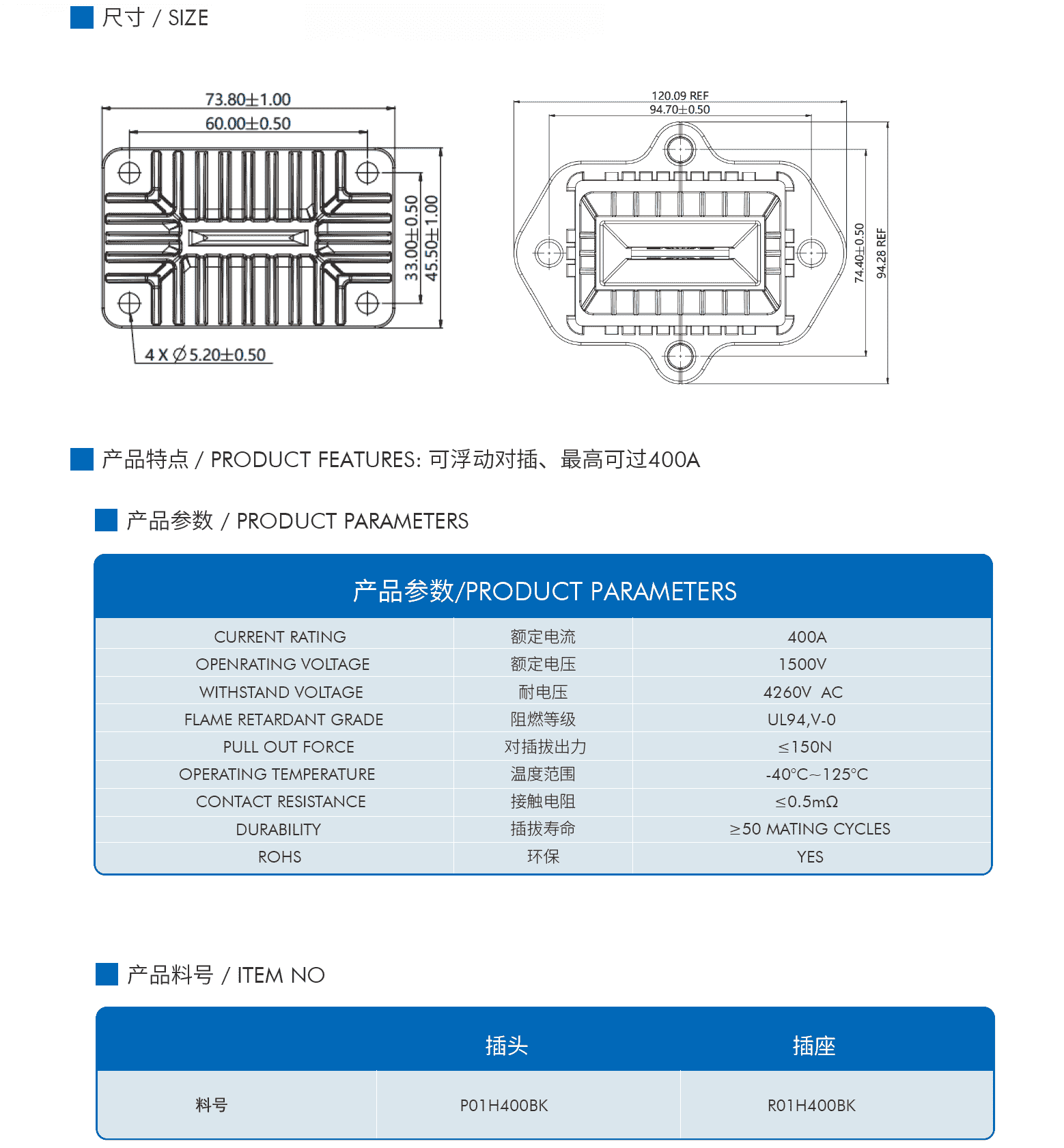 产品特点 / PRODUCT FEATURES: 可浮动对插、最高可过400A 电气特性 额定电流:400A 额定电压:1500V 耐电压:4260V AC 接触电阻:≤0.5mΩ 耐环境性能 温度范围:-40°C~125°C 防水等级:IP67 阻燃等级:UL94,V-0 插拔寿命:≥50 MATING CYCLES 环保:YES